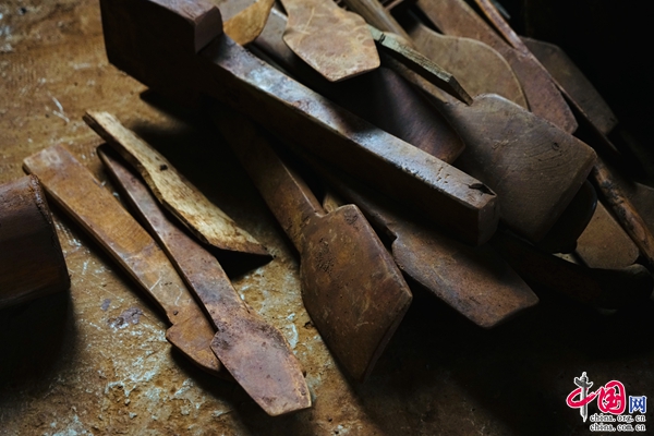 “選土、采土、舂土、篩土、泥曬土、羼料、制胚、鑲瓷、陰干、磨光、太陽(yáng)暴曬、火烘干、柴火燒制、焐熏、刷酸奶渣水......制作黑陶有十多個(gè)步驟,從采土到成品大概需要一個(gè)月的時(shí)間?!碑?dāng)珍批初介紹,制作黑陶的土是當(dāng)?shù)靥赜械募t色黏土和白色砂土,以及湯滿(mǎn)河風(fēng)化沙石研磨的石粉混合而成。制陶工具主要有工作臺(tái)板、木陶墊盤(pán)、木槌、大小木拍、木陶頂墊、頂棍、木刀、量具、花模印章等工具。黑陶品質(zhì)的高低則取決于制作者技術(shù)嫻熟度與制作經(jīng)驗(yàn),黑陶的“黑”是滲碳所導(dǎo)致,尼西窯外滲碳燒制技巧是黑陶燒制的“活化石”,其采用的是燜燒,燜燒時(shí)火內(nèi)缺氧,因此形成了還原反應(yīng)。黑陶的燒制方式也很原始,不搭建窯爐,而是在露天空地上生起一堆篝火,在燒制過(guò)程中,還需不斷在柴堆周?chē)砑犹O(píng)果枝、栗樹(shù)枝以助燃。