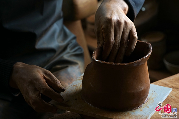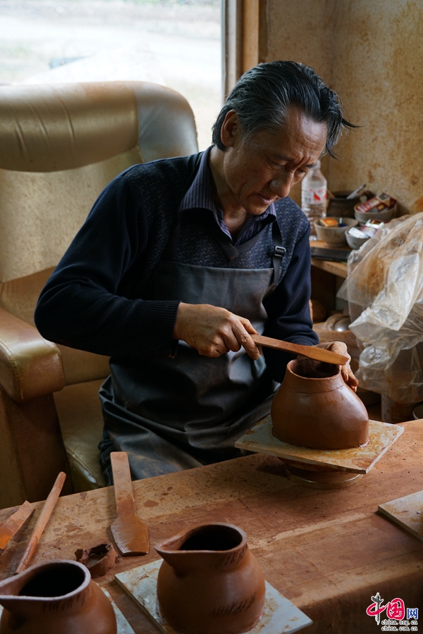 傳統(tǒng)的尼西黑陶肚大口小,選料精、做工細(xì),表面勾勒出簡(jiǎn)單花紋圖案或鑲嵌上各色瓷片作裝飾,獨(dú)具素樸粗獷之美。國(guó)家級(jí)非遺傳承人當(dāng)珍批初是家中黑陶技藝的第七代傳承人,在六七歲時(shí)開(kāi)始接觸黑陶,和祖輩學(xué)制陶技藝,掌握著120余個(gè)黑陶品種制作。在他的記憶里,黑陶制品從簡(jiǎn)單的日用器皿,逐漸向工藝品延伸,傳統(tǒng)技藝從好用實(shí)用,逐漸兼顧藝術(shù)美感,黑陶制品從過(guò)去的十余種,演變成了現(xiàn)在的上百種。