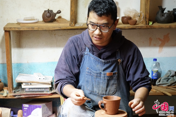當(dāng)珍批初的兒子拉茸肖巴是家族第八代手藝傳承人,他從云南民族大學(xué)畢業(yè)后,回鄉(xiāng)繼承了父親的手藝?!鞍凑占抑袀鹘y(tǒng)的想法,我應(yīng)該去考公務(wù)員,但是我就是喜歡燒黑陶。”拉茸肖巴進(jìn)行了大量的嘗試,制作裝飾用品、旅游工藝品,他還根據(jù)客戶(hù)需求,進(jìn)行私人訂制類(lèi)的生產(chǎn),比如黑陶咖啡杯等。除了拓展品種外,他和父親還嘗試用大電爐成批量燒制生活用品。“當(dāng)然,有些精心打磨的工藝品還采取傳統(tǒng)堆燒,平地上放置木材和陶胚燒制,這需要多年經(jīng)驗(yàn),要控制好溫度和有機(jī)原料的添加?!崩仔ぐ驼f(shuō)。