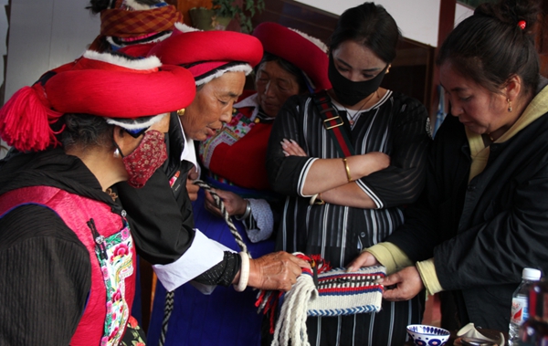 “這個(gè)手工編織的掛件還可以做得小一些,方便掛在包上做飾品?!敝笇?dǎo)老師介紹了杯墊、氆氌包、吉祥結(jié)等手工藝產(chǎn)品,并提出了改進(jìn)意見:“現(xiàn)在的市場(chǎng)需求比較多樣化,咱們手工藝品也需要?jiǎng)?chuàng)新,顏色可以做得更加多樣、種類也可以更加豐富一些”?,F(xiàn)場(chǎng)的婦女們拿起熱銷產(chǎn)品討論分析其制作工藝和改良方法,并用手機(jī)記錄,躍躍欲試,期待改良后的手工藝品能有好銷路。