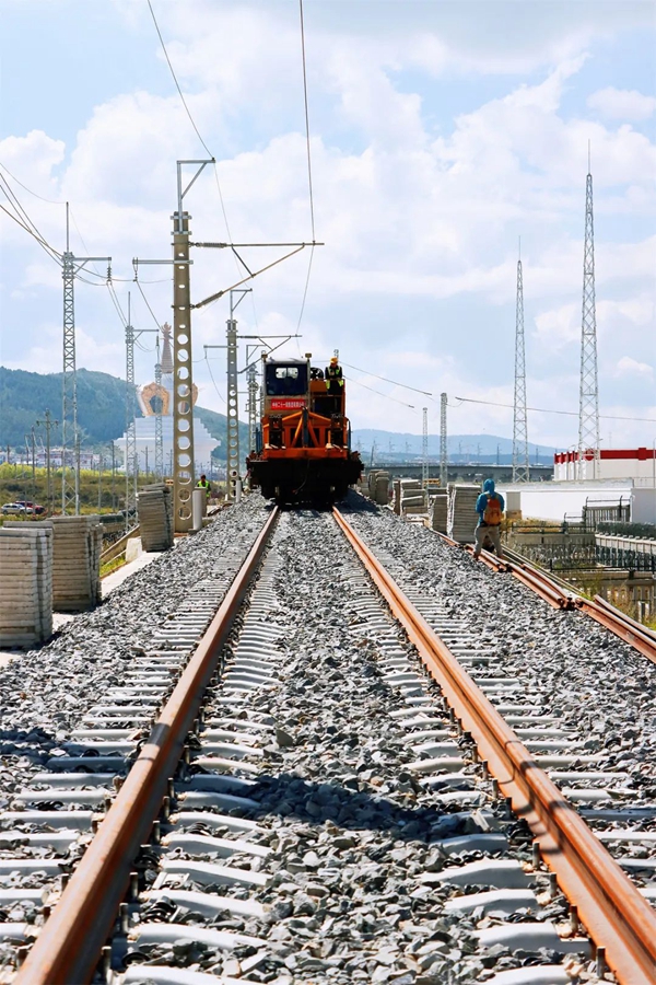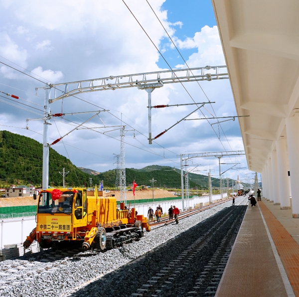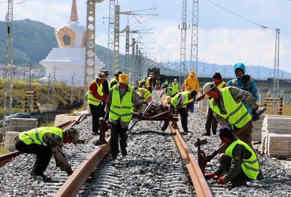 滇藏鐵路麗江至香格里拉段鋪軌過程中,經(jīng)歷了地形復(fù)雜、海拔高、交通不便、隧道工程比例高、線路坡度大等一個(gè)個(gè)“攔路虎”,中鐵二十一局的建設(shè)者們迎難而上,攻堅(jiān)克難,不斷優(yōu)化方案和資源配置,創(chuàng)新施工工藝,改造機(jī)械設(shè)備,采用機(jī)械化、自動(dòng)化鋪軌機(jī)組和施工信息化等手段,大幅提高了軌道幾何尺寸的精度和施工效率,自今年7月12日軌道鋪設(shè)至迪慶境內(nèi)以來,1000余名工作人員兩班倒,24小時(shí)不間斷施工,用時(shí)兩個(gè)多月,完成了后續(xù)長大坡道、橋隧相連地段鋪軌和架梁鋪架任務(wù),創(chuàng)造了高原鐵路單日鋪軌8公里的紀(jì)錄。