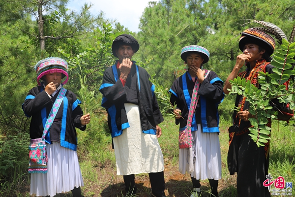 木葉,是阿旺彝族人民的樂器,漫山遍野的樹葉隨便摘下一片都能吹出動聽的聲音。這種最原始、最樸素的音樂,是彝族群眾傳情達意、表達內(nèi)心喜怒哀樂的載體。木葉音色優(yōu)美,音調(diào)起伏,悅耳動聽,深受彝族人民的喜愛。楊毛毛是當?shù)啬救~吹奏高手,她吹出來的木葉聲音清純、悠揚,能夠準確表達各種心情。她說:“吹木葉是從小放羊時學(xué)會的,吹了幾十年了。高興的時候吹一曲,悲傷的時候也吹一曲?!彼榻B,木葉吹奏講究的是心口合一,運氣均勻,村里有部分中老年人會吹奏,能夠組成一個木葉吹奏班上臺演奏。木葉吹奏隨心所欲,曲調(diào)千變?nèi)f化,只要有樹葉的地方就有音樂和歌聲。木葉吹奏是當?shù)匾妥逑让窳鱾飨聛淼墓爬峡诩?,起源于獵牧?xí)r代,用于傳聲、傳情;完善、豐富于當今,用于娛樂、抒情。村里豐收要吹木葉,喜事要吹木葉,談戀愛也要吹木葉,不少夫妻就是吹著木葉走到一起的。目前,阿旺鎮(zhèn)涌現(xiàn)出以楊毛毛、楊順蘭、朱八花、朱東花等為代表的木葉傳承人。