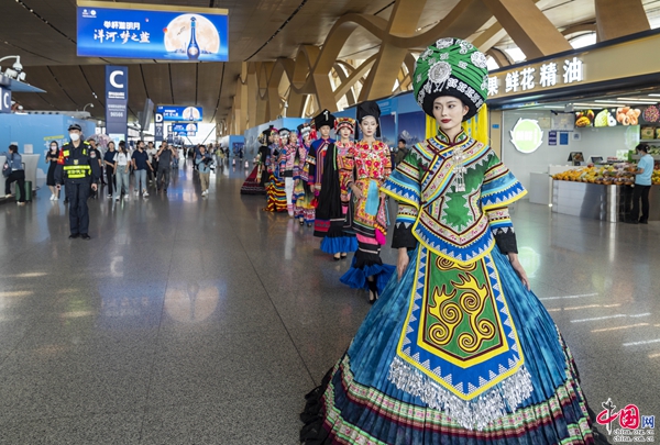 模特們圍繞機(jī)場航站樓B1層到達(dá)大廳和F3層出發(fā)大廳一路巡游,為現(xiàn)場觀眾呈現(xiàn)了一場精彩絕倫的非遺時尚秀。旅客們爭相與模特互動、拍照,現(xiàn)場掀起了濃濃的“最炫民族風(fēng)”。