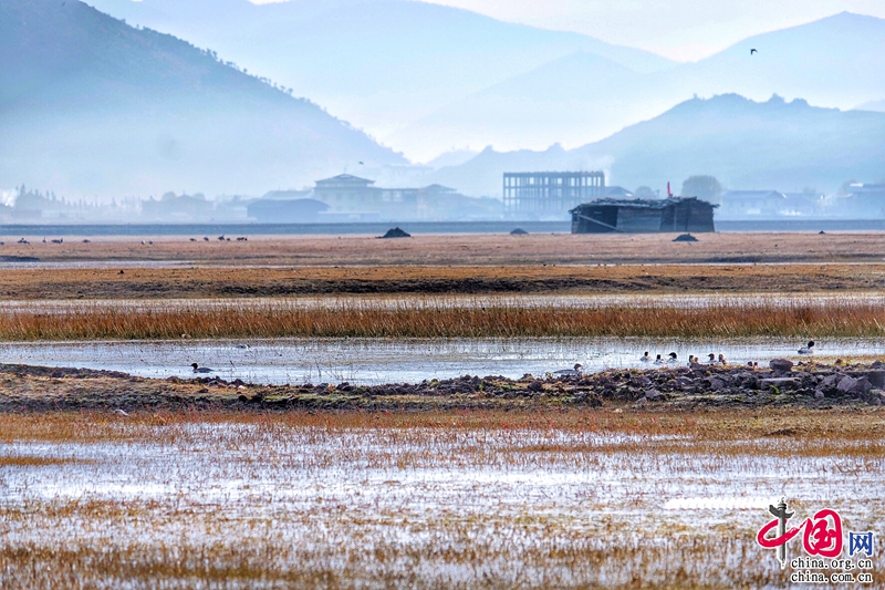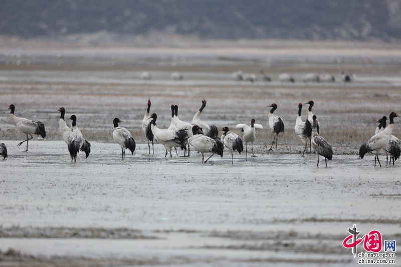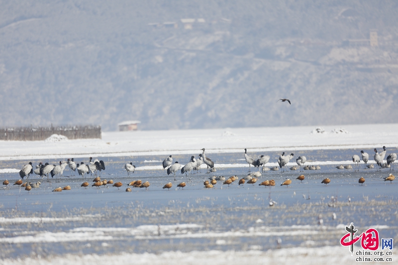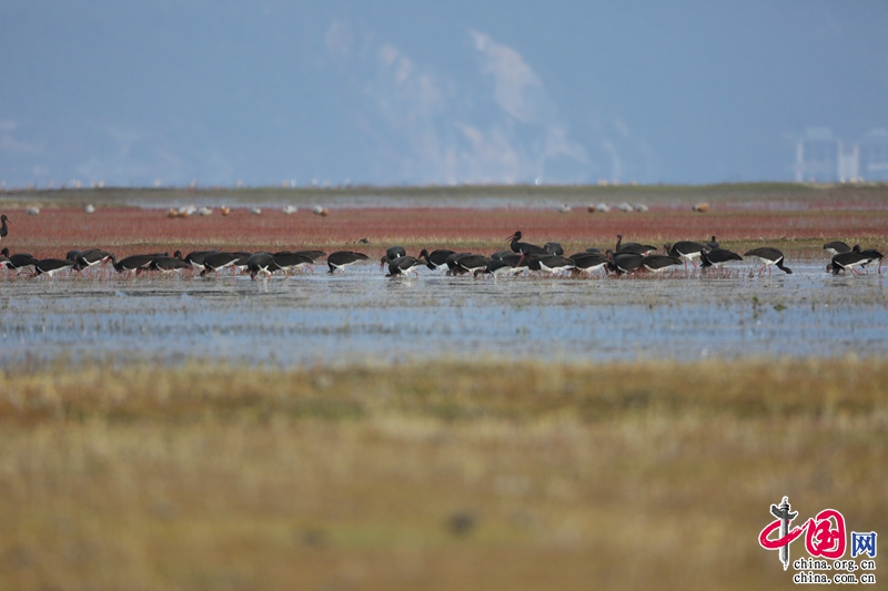每年10月,從青海、甘肅乃至域外南來的黑頸鶴不遠(yuǎn)千萬里來到納帕海,與斑頭雁、白鶴、黃鴨、赤麻鴨、綠頭鴨、黑鸛、灰頭鶴、大白鷺、白尾海雕、金雕、禿鷲等珍奇異禽共同覓食、嬉戲、繁衍生息。它們有的在納帕海上空盤旋飛舞;有的忙著筑巢、孵卵或給雛鳥喂食;有的三五成群,在水面上穿梭游弋,時(shí)而潛水覓食,時(shí)而追逐嬉戲……納帕海儼然已經(jīng)成為了冬季候鳥的樂園。(姚敏 迪慶州文化和旅游局供圖)