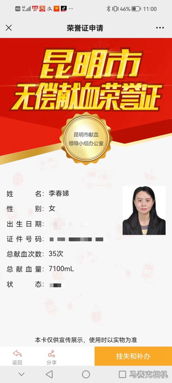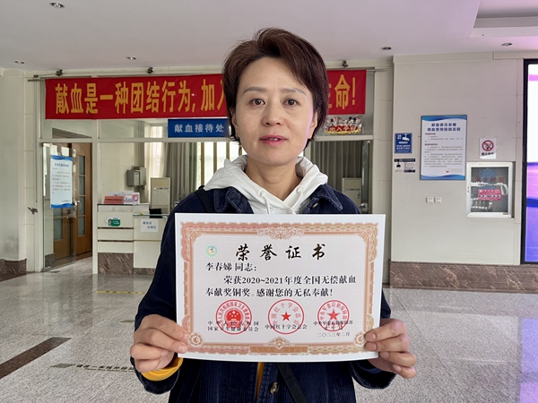 10月12日一大早,李春娣來到云南昆明血液中心,她熟練地測(cè)血壓、做化驗(yàn),看著自己各項(xiàng)指標(biāo)都符合獻(xiàn)血標(biāo)準(zhǔn),她躺到血細(xì)胞分離機(jī)上,左手邊是好幾個(gè)采血袋以及一根根塑料管子,整個(gè)過程大概一個(gè)半小時(shí),她又完成了一次成分獻(xiàn)血。獻(xiàn)完血后,李春娣領(lǐng)取了自己的“2020—2021年度全國無償獻(xiàn)血奉獻(xiàn)獎(jiǎng)銅獎(jiǎng)”榮譽(yù)證書,她說:“真的沒有想到能獲得這個(gè)獎(jiǎng)項(xiàng),也感到非常榮幸?!?/p>