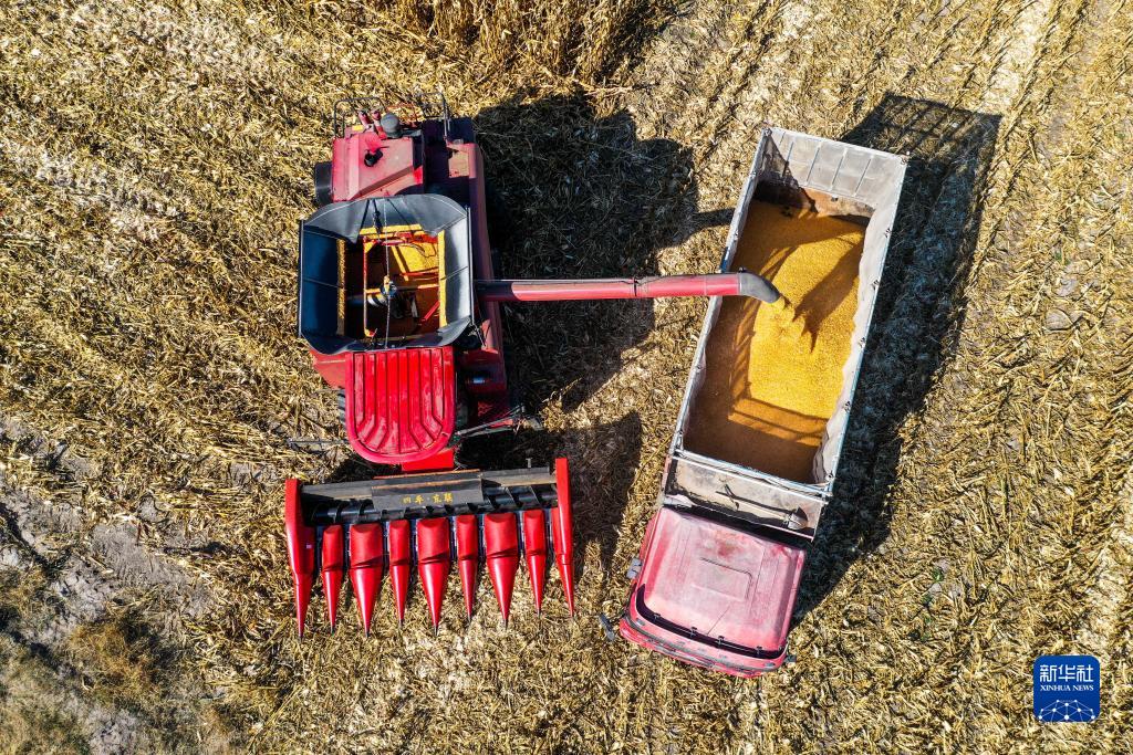 10月15日,在內(nèi)蒙古通遼市科爾沁左翼中旗腰林毛都鎮(zhèn)車家子嘎查,籽粒收割機(jī)將玉米裝入運(yùn)糧車,再運(yùn)輸至“糧食銀行”(無(wú)人機(jī)照片)。