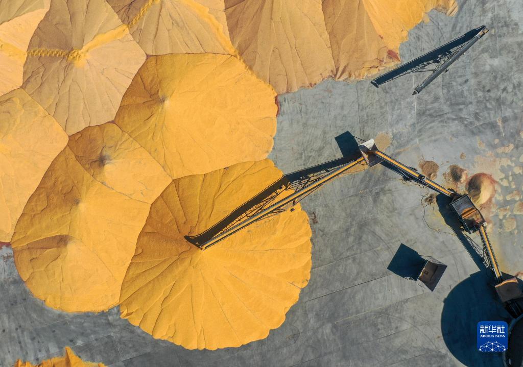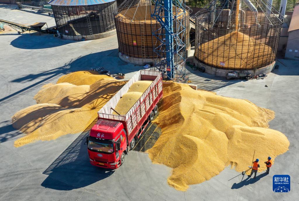 10月15日,在內(nèi)蒙古通遼市科爾沁左翼中旗腰林毛都鎮(zhèn)一家“糧食銀行”,工人在卸糧(無(wú)人機(jī)照片)。