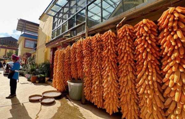 走進安寧市摩所營村委會向陽村,富有彝族特色的屋舍儼然,干凈整潔的道路兩旁,黃墻紅磚的房屋鱗次櫛比,掩映著綠意和繁花交相輝映;房門口整面墻掛滿了金燦燦的玉米,老人們在古樹下“曬”太陽,年輕的彝族婦女在秋日和煦的陽光下一針一線細細縫制彝繡服裝。