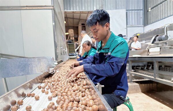 (寧洱堅果加工廠的工人正在篩選優(yōu)質(zhì)堅果)