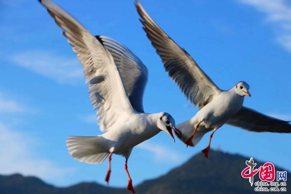 每年冬季,一群群白色的精靈妝點(diǎn)著昆明的綠水藍(lán)天。紅嘴鷗跨越烏布蘇湖、吉爾吉斯湖流域、貝加爾湖南部地區(qū)和博斯騰湖流域,來到春城昆明度過它們鐘愛的溫暖冬季。雖然它們來自北西伯利亞,但卻是昆明“每年一度”的標(biāo)志性風(fēng)景線,紅嘴鷗光臨昆明已近40年。在滇池畔海埂大壩、翠湖公園、大觀公園、篆塘公園、撈漁河濕地公園……都可以看到它們肆意的身影。特別是海埂大壩每年“觀鷗潮”來臨時(shí),大壩的游客量日峰值可達(dá)到10萬余人次。遼闊的山色、接天成碧的湖水是相對的靜謐,而紅嘴鷗忽而振翅高飛、忽而停歇于水面,又或是頻繁和人們互動嬉戲的畫面則表達(dá)著動態(tài)與活力,二者交匯,也就奏響了昆明綠色發(fā)展和生態(tài)文明建設(shè)的和諧之歌。