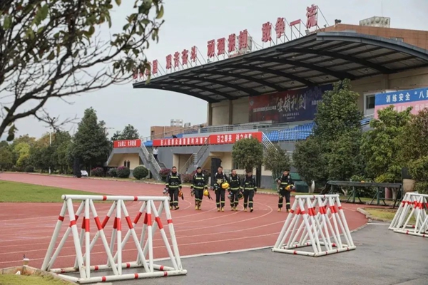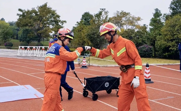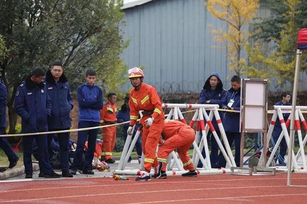 “最強搭檔”在百米消防障礙競賽中,支隊滕紹杰、陳林2名隊員化身最強搭檔參加該科目競賽。攜帶水槍徒手翻越障礙板,下板后手提兩盤水帶上至獨木橋,保持身體平衡通過獨木橋,下橋后完成水帶、分水器和水槍的連接,打繩結(jié)、抬假人、沖出終點線,所有動作一氣呵成,不浪費一分一秒。在第一輪操作成績不理想的情況下,他們頂住壓力,第二輪壓軸出場,逆轉(zhuǎn)取勝,最終,以43秒48逆轉(zhuǎn)取勝,勇奪第一。
