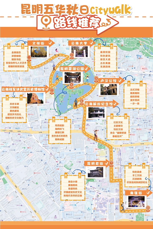 沿著城市的大街小巷,品嘗各種美食,欣賞各色風(fēng)景,將屬于昆明五華的溫暖留在心間,快和小伙伴到昆明五華來(lái)一場(chǎng)說(shuō)走就走的Citywalk吧?。◤埮嗄?nbsp;五華區(qū)融媒體中心供稿)