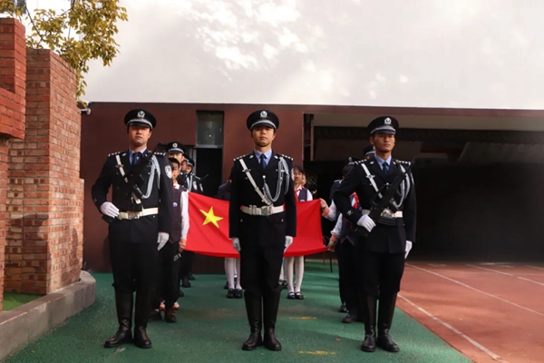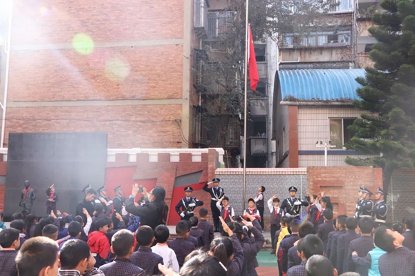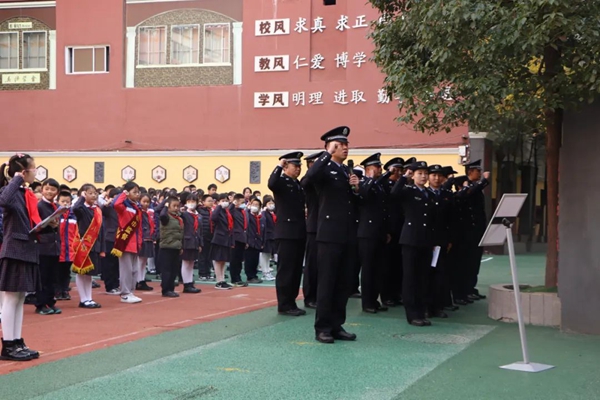 參觀完畢后,共同舉行了升旗儀式,分局國旗班的隊員們和學校小旗手們大手牽小手,共托一面旗,同擎一根索,合唱同首歌,國旗下的警禮莊嚴肅穆,國旗下的隊禮少年風發(fā)。