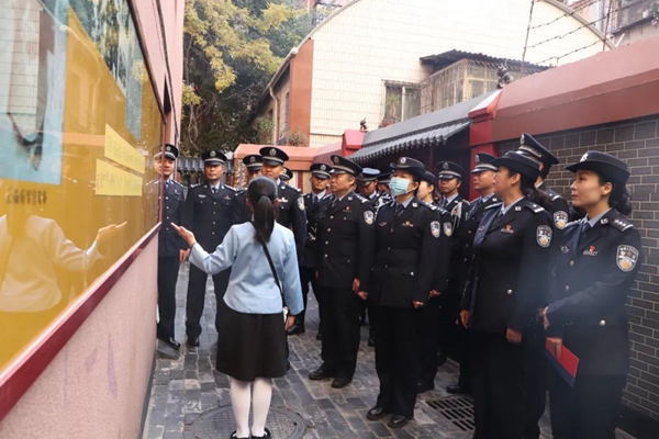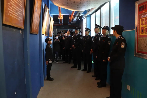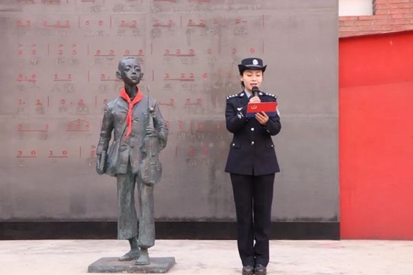 活動開始,分局黨員民輔警代表在學校聶耳精神宣講團小宣講員們的帶領(lǐng)下依次參觀了校園文化建設(shè),沿著“成長之路”文化墻來到校園正中矗立著的小學生聶耳銅像前,瞻仰了鐫刻著國歌詞曲的前進墻,在23級臺階下聆聽了同學們的小提琴合奏,又跟隨著小講解員們的步伐進入了歷史場景還原式展覽廳——勸學巷,傾聽了聶耳家風家訓(xùn)。
