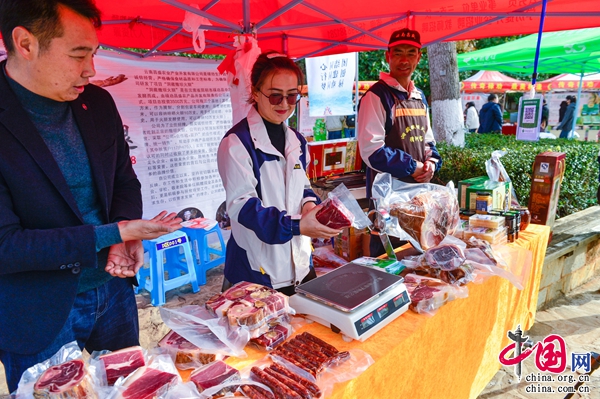 在祿勸農(nóng)特產(chǎn)品展區(qū),撒壩火腿的展區(qū)前,擠滿了前來購買火腿的顧客?!拔覀兇舜螏淼漠a(chǎn)品已經(jīng)銷售一空。祿勸撒壩火腿在海拔三千多米,擁有杜鵑花海的馬鹿塘鄉(xiāng)腌制晾曬,又在上萬年的溶洞里發(fā)酵而成,品質(zhì)優(yōu)良,很受市場歡迎。撒壩火腿產(chǎn)業(yè)的發(fā)展,也帶動了我們當?shù)馗髯迦罕娫鍪罩赂??!痹颇喜⑥r(nóng)業(yè)產(chǎn)業(yè)開發(fā)有限公司總經(jīng)理高玉凡介紹到。