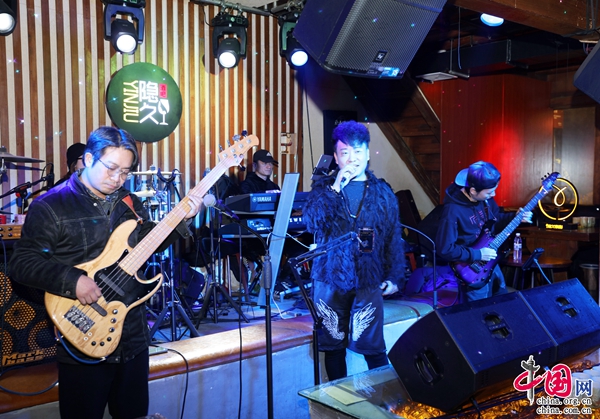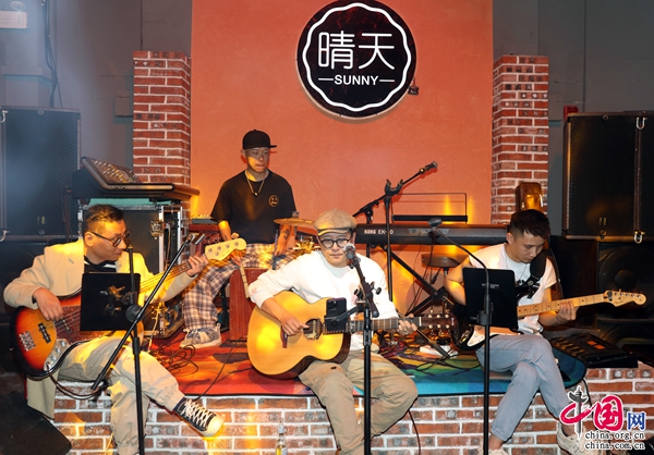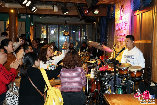 “你看天色又在遠(yuǎn)處落下,寂寞的城道別天邊晚霞。陌生的朋友請你聽我講,許多年前我曾有夢想……”麗江古城飲玉巷“醉鄉(xiāng)民謠”酒吧,伴隨吉他聲、貝斯聲、鼓聲、歌聲漸次響起,人們的歡呼聲此起彼伏。