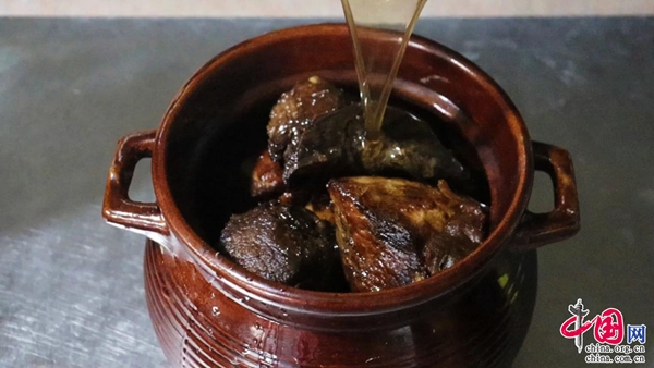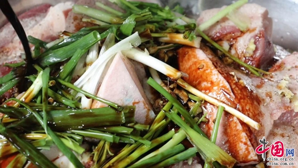 當(dāng)?shù)厝私榻B,油炸肉的吃法并不復(fù)雜,只需簡單的烹飪便可成為一道令人味蕾大開的佳肴。吃時,從壇子里掏出兩三塊油炸肉,放在鍋上蒸或切片用蒜苗炒,嘗起來肥瘦相間,幾番咀嚼,軟糯熏香溢滿唇齒間,讓人回味無窮。