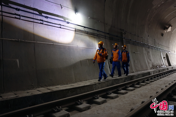 (周宇生和工友一起對麗香鐵路隧道通信設(shè)備進(jìn)行巡視檢查。向攀/攝)