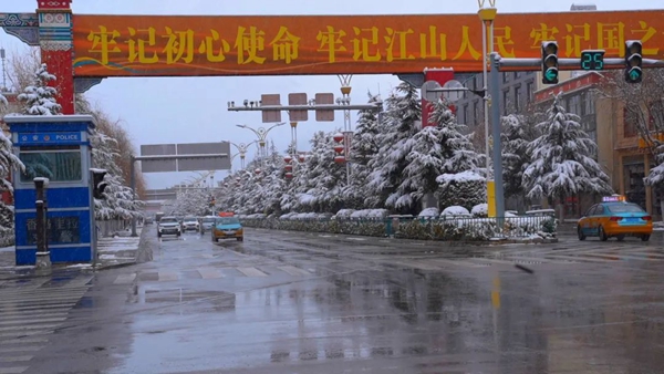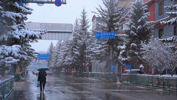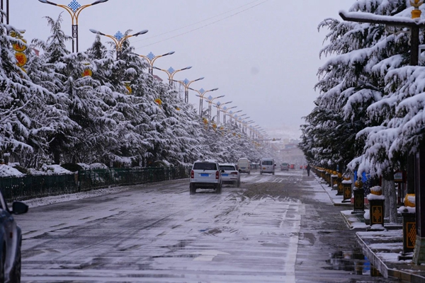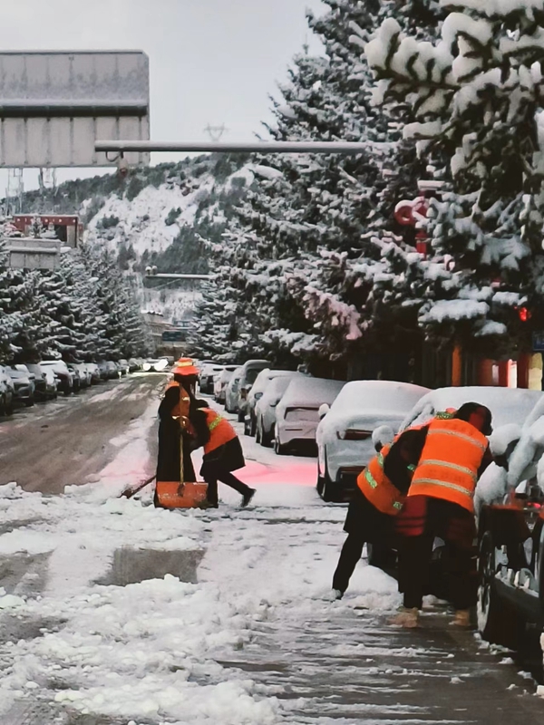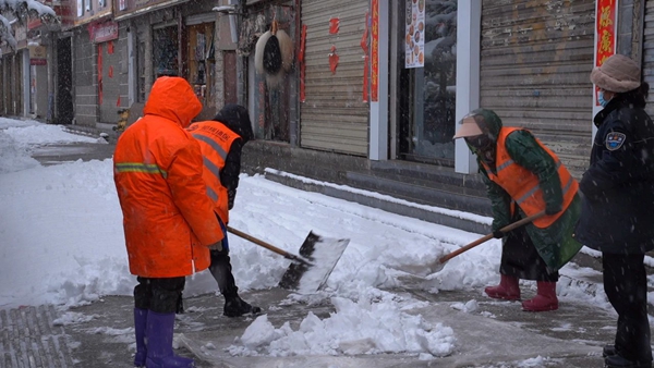 (為防止路面結(jié)冰,環(huán)衛(wèi)工人冒著風(fēng)雪,對道路進(jìn)行鏟雪作業(yè),保障市民出行安全。拍攝者:洛桑頂珠)
