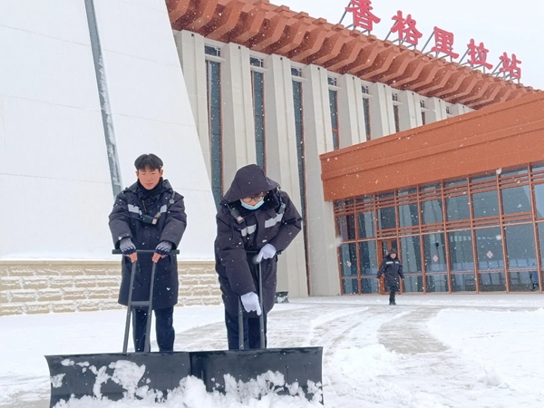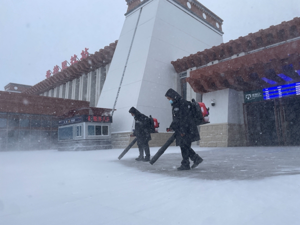(在香格里拉火車站,工作人員全員出動,積極掃雪除冰,確保節(jié)后旅客出行安全。拍攝者:李文琪)