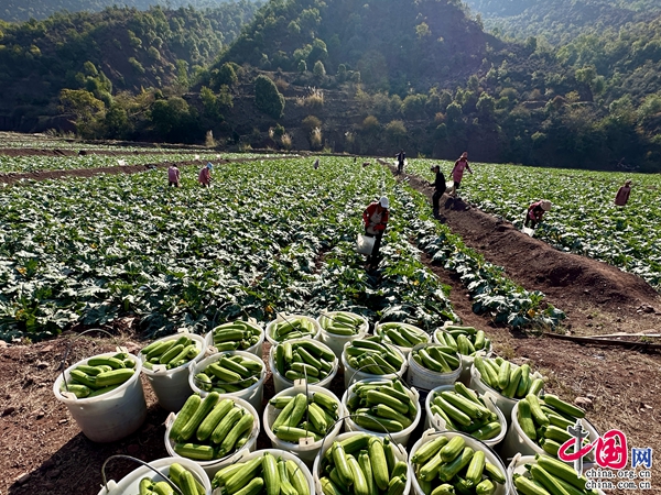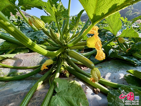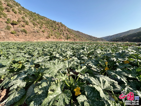 在云南省楚雄彝族自治州雙柏縣大麥地鎮(zhèn)河口河流域平坦廣闊的土地上,一排排翠綠的西葫蘆正在茁壯成長(zhǎng),齊膝高的瓜蔓之間,鮮艷的黃花與細(xì)長(zhǎng)條的西葫蘆交錯(cuò)生長(zhǎng),生機(jī)盎然。