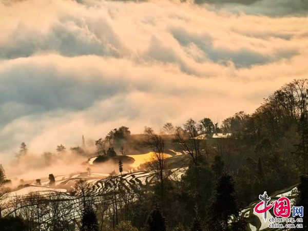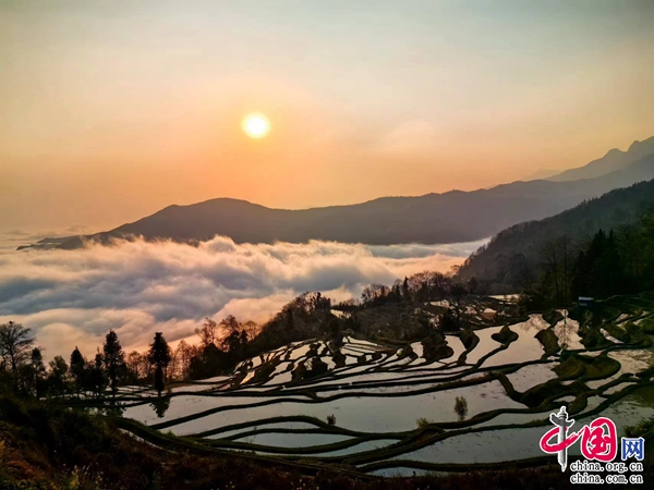 翻涌的云霧與梯田組成了一幅絕美畫(huà)卷。而掩映在云海中的村寨仿佛云端深處的秘境。日出時(shí),變化無(wú)窮的日光映在梯田里折射出萬(wàn)千景色。