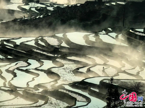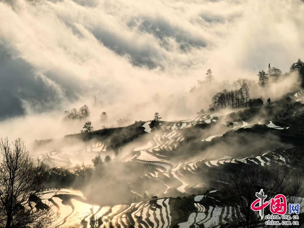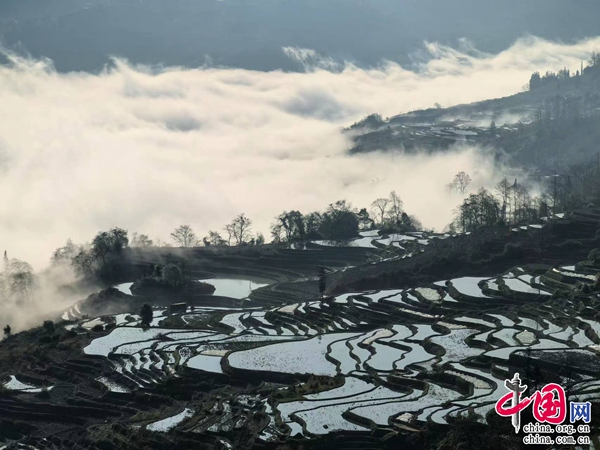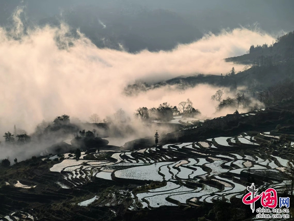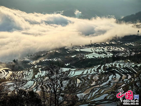 在這個(gè)時(shí)期,梯田如同鏡子般反射著天空的色彩,森林、村寨、梯田、水系“四素同構(gòu)”的生態(tài)系統(tǒng)勾勒出一幅人與自然和諧共生的美麗畫(huà)卷。