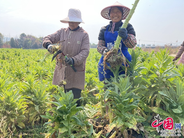 在云南省保山市昌寧縣田園鎮(zhèn)勐廷社區(qū)貢菜種植基地里,農(nóng)戶們忙著抹葉、收割,呈現(xiàn)出一派熱火朝天的景象。