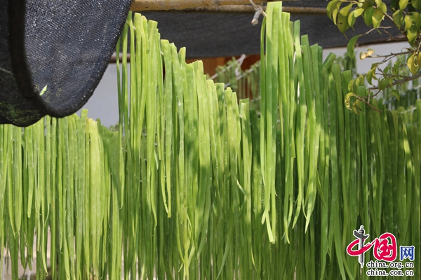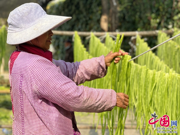 家住田園鎮(zhèn)勐廷社區(qū)的馬大姐剛采摘完貢菜,便開始修葉、削皮、劃條、晾曬。一道道工序井井有條,一棵棵貢菜逐漸變成細(xì)細(xì)的長條,上架晾曬,成為一條條增收“鏈子”。