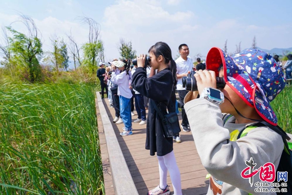 同時,濕地鳥類觀察科普研學活動也拉開了帷幕。在專業(yè)鳥類專家的帶領下,30組社區(qū)親子家庭一同走進運糧河濕地深處,手持望遠鏡,學習正確的觀鳥方式,嘗試探尋鳥類的蹤跡。