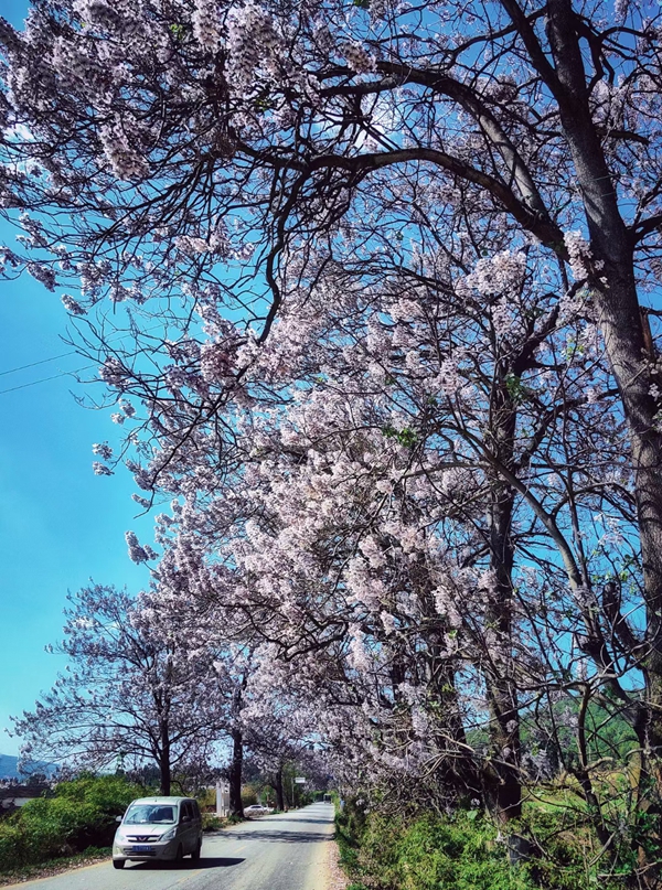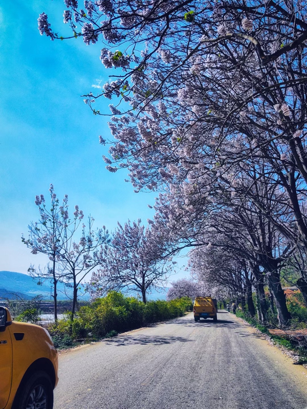 在昆明市安寧市縣街安八線鳴矣河和雙村段,有一片長約兩公里的淡紫色泡桐花海,在公路旁開出了一路浪漫與芬芳。?
