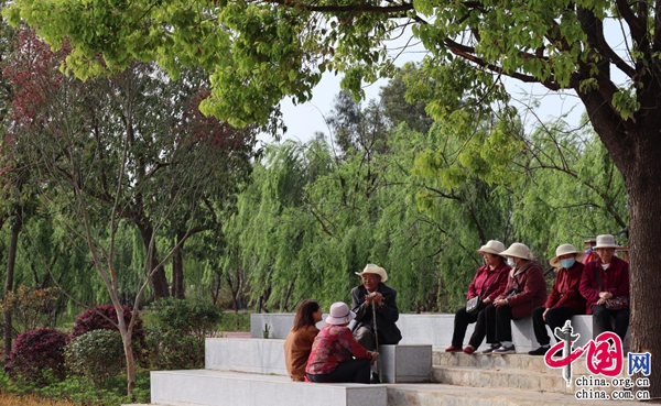 (在生態(tài)步道上休閑聊天的老人,拍攝于4月7日)