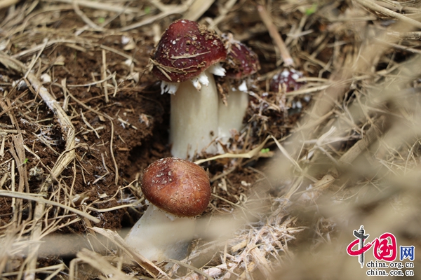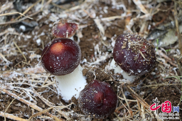 在保山市昌寧縣田園鎮(zhèn)四角田社區(qū)小龍?zhí)堵愤叺牟鑸@里,俯身用手扒開厚厚的稻草,就會看見一簇簇戴著赤紅色帽子的“白胖子”,穿過厚厚的土層,破土而出,那紅色的小帽子上沾著的泥土和草稈是它成長路上的“勛章”,一朵朵赤松茸,長得如此敦實,在茶園里東一簇、西一簇地長著,整個茶園彌漫著赤松茸的香氣,讓人沉醉其中。
