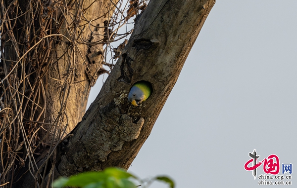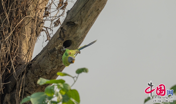 “近幾年來,我們每年都能在瑞麗江畔拍攝到花頭鸚鵡覓食或嬉戲的畫面,但一直沒有找到繁殖的巢穴。那天,我像往常一樣到江邊轉(zhuǎn)悠,看到2只花頭鸚鵡在一棵樹的樹梢上玩耍。就在我變換角度拍攝它們嬉戲畫面的時候,它們中的1只突然飛進(jìn)那棵樹樹干上的一個洞里?!鄙鷳B(tài)攝影師尹顯倫說道。據(jù)悉,經(jīng)過他連續(xù)10多天的蹲守、觀察、拍攝,可以肯定這對花頭鸚鵡在此筑巢育雛。
