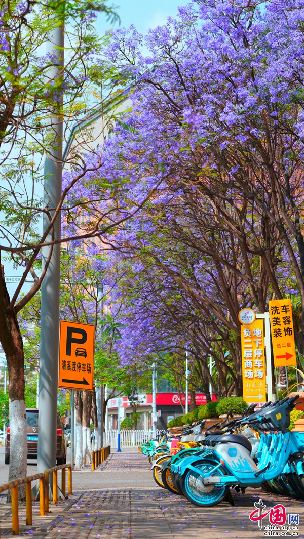 當(dāng)你還在沉浸于隨處可見(jiàn)的月季中時(shí),昆明市官渡區(qū)各條街道上的浪漫紫已悄然上線,滿屏都是紫色的浪漫。在官渡區(qū)的春城路、廣福路、珥季路、環(huán)湖東路、古渡口路、福達(dá)路、季官路等主次干道,盛開(kāi)的藍(lán)花楹形成一片片花海,用滿眼的紫色向世人展示“有一種叫云南的生活”。藍(lán)花楹每年在4月上旬開(kāi)始盛開(kāi),花期將一直持續(xù)到5月中旬。