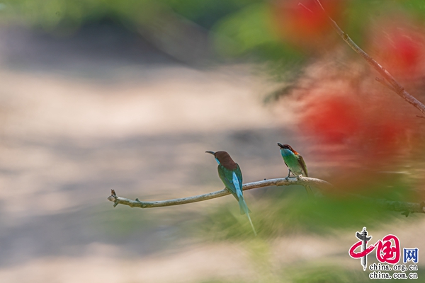 元江江畔,成群結(jié)隊(duì)的栗喉蜂虎占據(jù)了這一方天地,它們有的依偎在枝頭“談情說(shuō)愛”,有的忙著“裝修”自己的新家,有的展翅翱翔捕食昆蟲。