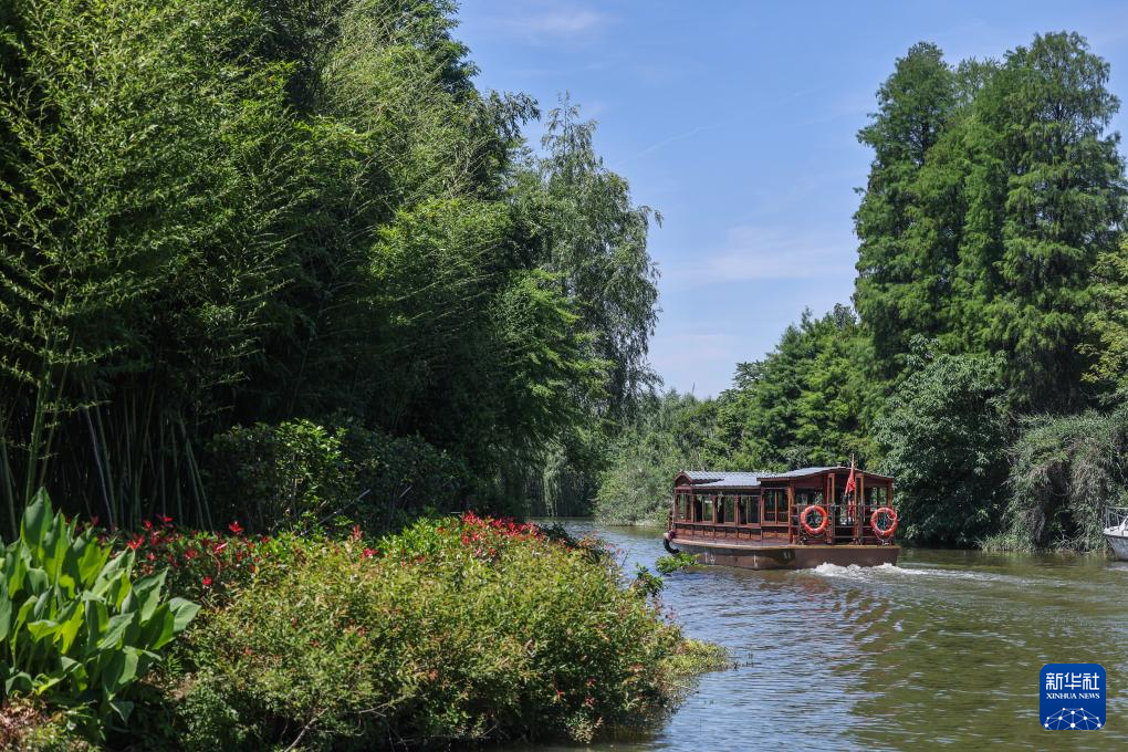 5月16日,電動游船行駛在白塔湖國家濕地公園的水面上。