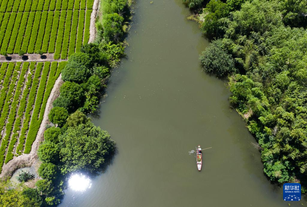 5月16日,工作人員在白塔湖國家濕地公園打撈水面漂浮物(無人機照片)。