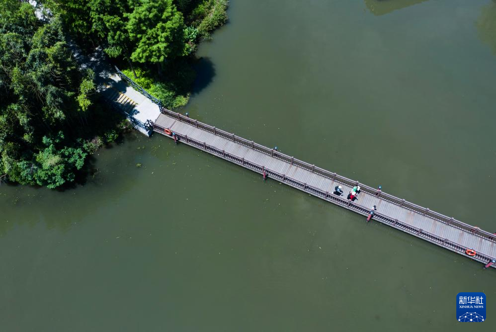 5月16日,游客走在白塔湖國家濕地公園的棧橋上(無人機照片)。