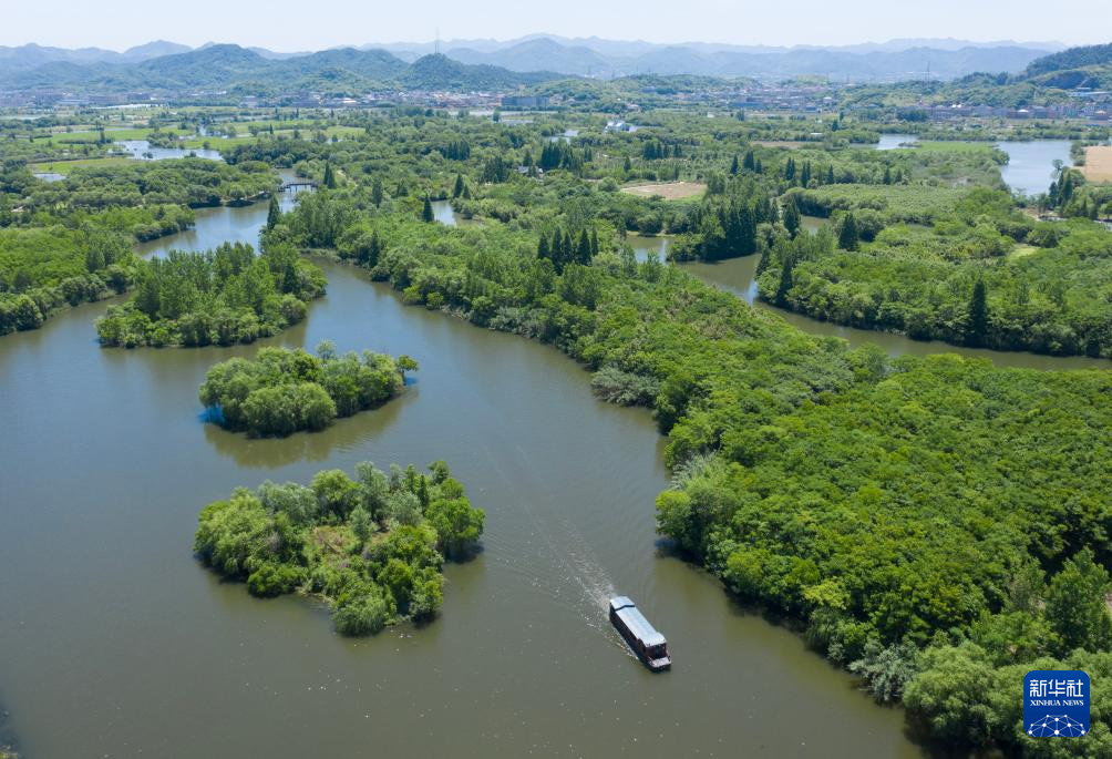 5月16日,電動游船行駛在白塔湖國家濕地公園的水面上(無人機照片)。