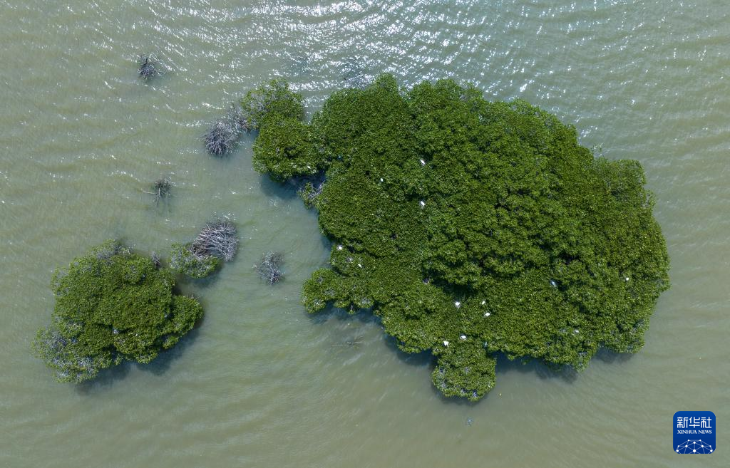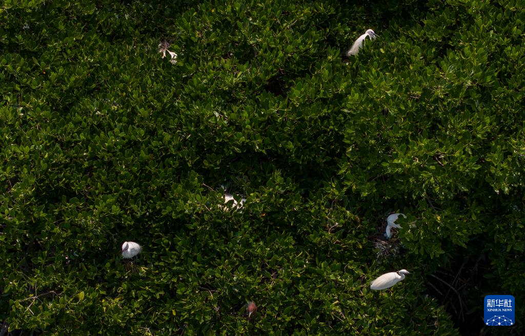5月17日,在廣東湛江金牛島,鷺鳥(niǎo)在紅樹(shù)林上棲息(無(wú)人機(jī)照片)。
