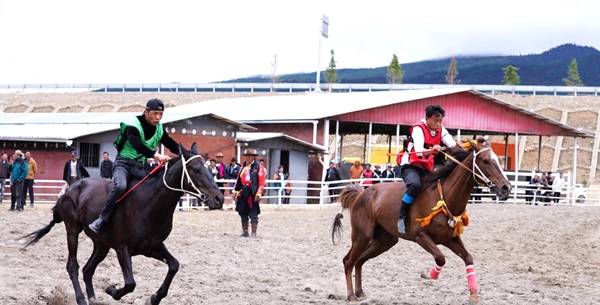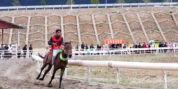 在民族團(tuán)結(jié)文化交流區(qū),一頂頂白色的帳篷在青綠色的草甸上顯得格外醒目;在民族賽馬區(qū),隨著《歡樂香巴拉》音樂聲響起,騎手們表演了馬背倒立、跑馬拾哈達(dá)、騎馬射箭、雙人疊羅漢……在比賽環(huán)節(jié),隨著裁判一聲令下,一匹匹駿馬昂首奮蹄,爭先競出。矯健的騎手們手握韁繩,策馬揚(yáng)鞭,展現(xiàn)了馬背上的速度與激情。