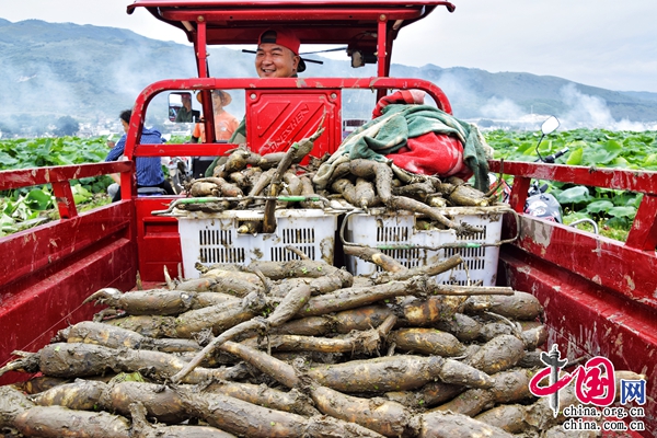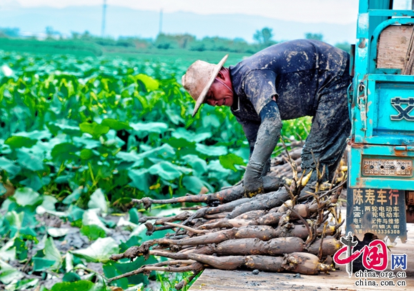 “我的3畝蓮藕從5月20日就開始上市了,價(jià)格每公斤在8元左右,預(yù)計(jì)會有3萬多元的收入,鄉(xiāng)村振興我們信心滿滿”??粗R而壯碩的蓮藕如小山般堆放在收購商車上,正在田中挖藕的云南省紅河州彌勒市竹園鎮(zhèn)土橋村委會益者村種植戶陶保坤的笑容綻放在臉上。