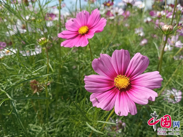 游客何存說:“這邊的格桑花開得非常好,非常有特色?!备裆;ㄓ址Q格桑梅朵,原是青藏高原上美麗的花朵。在藏語中,“格?!笔恰懊篮脮r光”或“幸?!钡囊馑迹虼烁裆;ㄒ脖环Q作幸福花,象征著幸福美好的生活。據(jù)介紹,楚源鄉(xiāng)農業(yè)生態(tài)園今年引進玫紅色新品種開始種植,一共種植了40畝。
