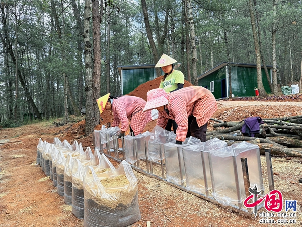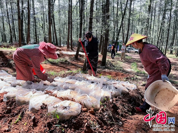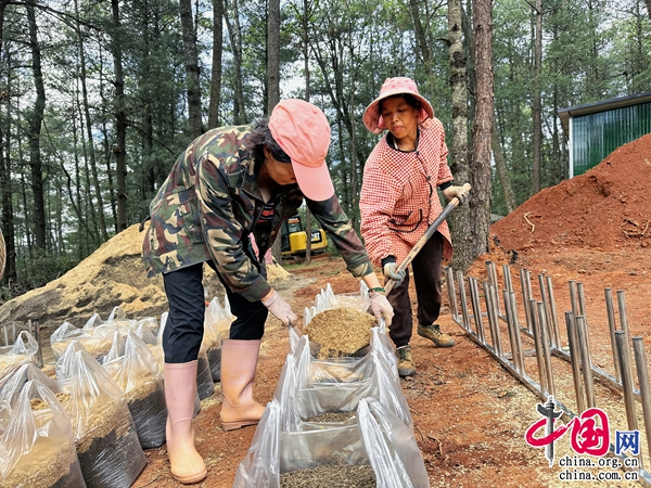 當(dāng)前正值天麻育種黃金時(shí)期,在紅塔區(qū)小石橋鄉(xiāng)小石橋村的天麻種植基地,村民們正搶抓時(shí)機(jī)進(jìn)行天麻育種。鋸木、拌粉、裝袋……整個(gè)過(guò)程嚴(yán)謹(jǐn)細(xì)致,有條不紊。而在另一邊,一袋袋裝好的天麻種被整齊碼放在事先打好的塘里,經(jīng)過(guò)填土、覆葉后完成育種。