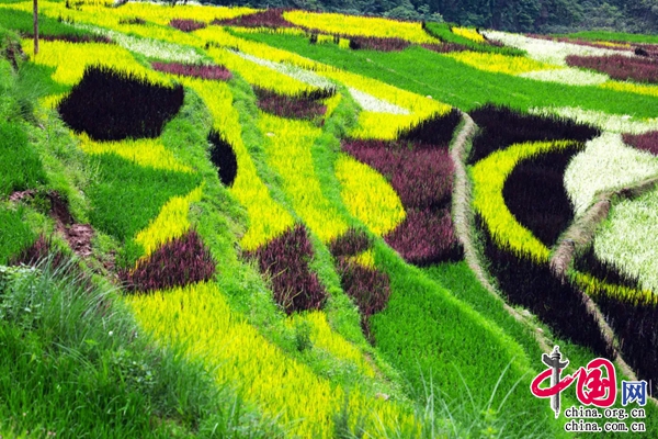 據(jù)農(nóng)技人員介紹,選用不同的水稻品種培育出不同顏色的水稻,經(jīng)過圖案設(shè)計、定點測繪、人工栽種,精細巧妙地將各色水稻和紫稻相互穿插組合,再加上后期的田間管理,種出色彩斑斕的彩色稻田畫,打造一道獨特的農(nóng)業(yè)景觀。