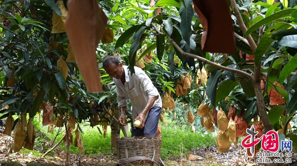 “采摘鷹嘴芒不能等待其完全成熟后再進(jìn)行,通常在七八成熟時(shí)就可采摘,采了以后通過(guò)打包、運(yùn)輸?shù)较M(fèi)者手里,基本上五六天即可成熟,就可以吃了,而且口感更佳?!甭£?yáng)區(qū)潞江鎮(zhèn)白花村的果農(nóng)楊宴宗傳授著鷹嘴芒的采摘秘訣。