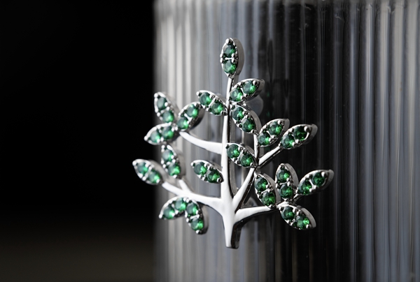 趙益介紹道,“一葉千年”胸針設(shè)計(jì)靈感汲取自普洱景邁山古茶林文化景觀的意象。2023年,普洱景邁山古茶林文化景觀成功申遺,成為中國(guó)第57項(xiàng)世界遺產(chǎn)。在設(shè)計(jì)中采用鍍銀和綠色寶石鑲嵌技術(shù),象征景邁山茶樹(shù)的生機(jī)與繁榮。這一設(shè)計(jì)不僅表達(dá)了茶樹(shù)的翠綠與生命力,更傳承了深厚的文化意義。