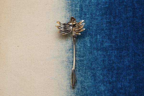 “空谷幽蘭”胸針的設(shè)計(jì)靈感源自他今年春節(jié)在麻栗坡縣原始森林里拍攝時(shí)發(fā)現(xiàn)的一朵珍稀蘭花——扁莖叉柱蘭。通過(guò)與專家的溝通確認(rèn),這一物種在國(guó)內(nèi)時(shí)隔22年再次被發(fā)現(xiàn)。胸針采用云南傳統(tǒng)古銀制法,模擬出花瓣和苞片的細(xì)膩紋路,展現(xiàn)了植株的獨(dú)特魅力。