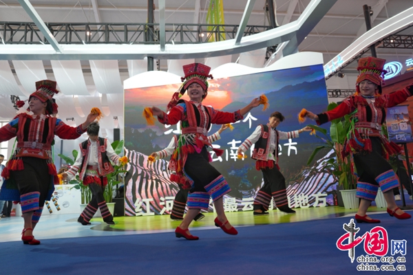 “山上開的馬纓花,哪個最愛她?”在第8屆中國—南亞博覽會暨第28屆中國昆明進(jìn)出口商品交易會(以下簡稱“南博會”)文化旅游體育館內(nèi),紅河展位熱鬧非凡,彝族兒女們伴著一首旋律輕快的《馬纓花》翩翩起舞,吸引了不少國內(nèi)外游客的目光。